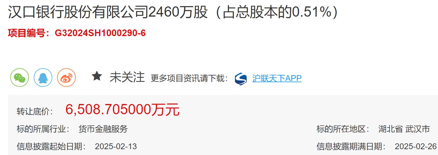 2月13日,据上海联合产权交易所消息,中国电信(全称“中国电信集团有限公司”)挂牌转让所持汉口银行2460万股股份,占总股本的0.51%,转让底价约6508.71万元,信息披露期满日期为2025年2月26日。