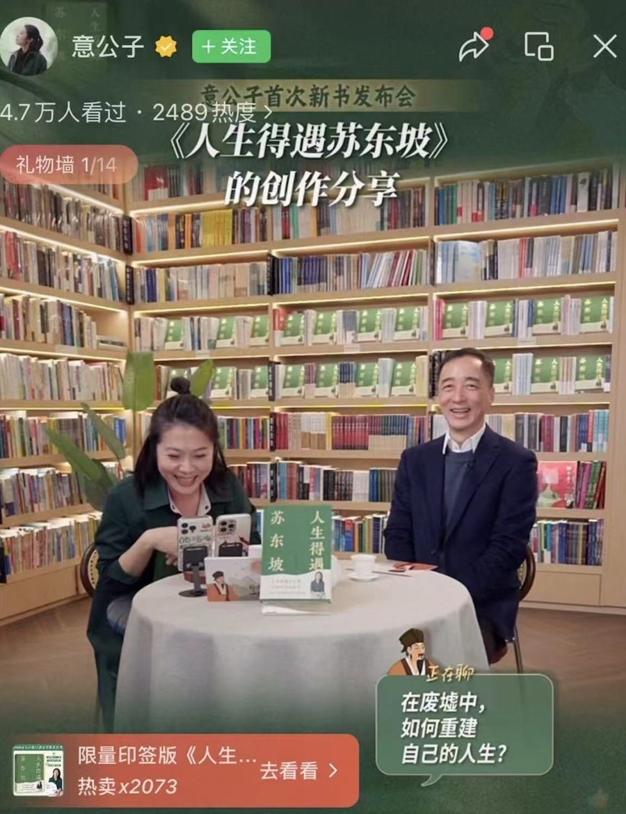 当天,意公子还做客果麦书店,以“人生得遇苏东坡,方知可以这样活”为主题,与该书出品方果麦文化董事长路金波、高级副总裁王誉开启一场长达三小时的深度线上对谈直播,累计超过70万观看。