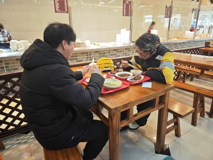 在石化街道动员下,辖区多家餐饮企业加入爱心套餐行列。金一路美食美分大食堂为外卖骑手推出七折专属优惠,每日午、晚餐时段均可享受。“每次来这里吃饭,都能享受到优惠,感觉特别温暖,更坚定了扎根金山的决心。”甘肃籍骑手郭玉海说道。卫零路街区党支部牵头发起倡议后,店主梁茂平积极响应:“他们是城市的‘奔跑者’,我们希望通过优惠餐食传递关怀。”