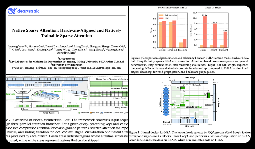 这篇论文的核心关于NSA(Natively Sparse Attention,原生稀疏注意力)。据DeepSeek,上下文建模对于下一代语言模型至关重要,但标准注意力机制的高计算成本带来了巨大的计算挑战。NSA(稀疏注意力)在提高效率同时,为提高模型能力提供新的方向,实现将算法创新与硬件对齐的优化相结合,进行高效的长上下文建模。