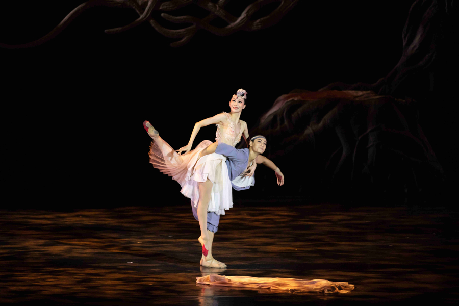 大幕拉开,悠扬乐声响起,羽色绯红、脖颈高昂的“朱鹮”款步而至,她们的赤色脚掌轻拍水面,泛起爱的涟漪。舞剧以朱鹮的死亡与重生,折射出人类共同面临的环保命题。演出结束谢幕时,许多日本观众眼含泪水,集体起立鼓掌。
