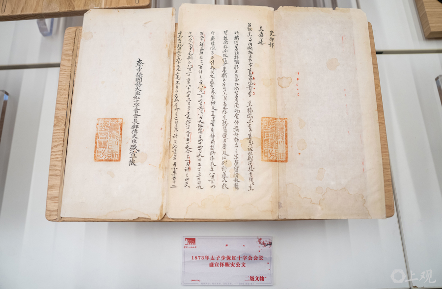 此次展示了208件/套重要藏品,其中多为珍贵文物。如1873年太子少保红十字会会长盛宣怀赈灾公文,上海工部局织绣大型徽标,董必武使用过的手杖,刘清扬手稿《中国妇女运动的发展与抗战任务》,1925年上海五卅惨案声援运动银质纪念章,1941年《共产党人》(土纸本)等8件/套国家二级文物。1897年伦敦出版马克思著《东方问题》(英文版),1915年《奉天教育品展览会国文成绩》(一至四册),1919-1923年社会主义研究社出版山川均、山川菊荣主笔《社会主义研究》,1929年上海亚东图书馆发行高语罕编《白话书信》,1934年《渔光曲》黑胶唱片,抗战时期晋察冀边区抗日宣传画等58件/套国家三级文物。同时还有中国第27次南极科考队员签名旗帜等见证新时代伟大飞跃的藏品,艺术家创作的反映人民美好生活、传递正能量的瓷器、绘画、刺绣、书法艺术品等。