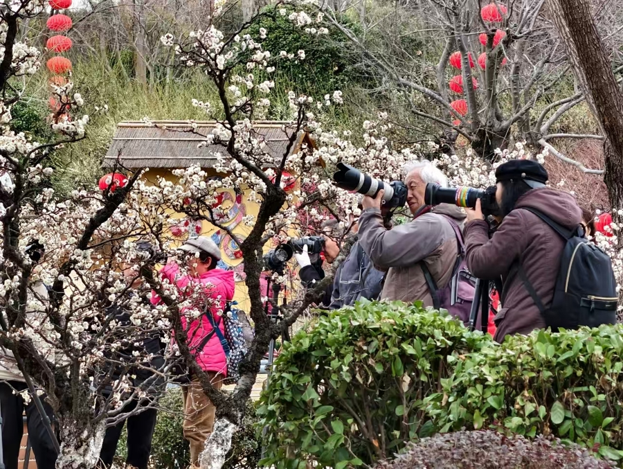 莘庄梅园门口草坪上几株梅树上灯笼高挂,早开品种粉红朱砂带来春天的气息;往里走,龙游梅品种群周围聚集了众多摄影爱好者,长枪短炮寻找角度——龙游梅单朵花期仅有8天,谁也不肯错过呀。
