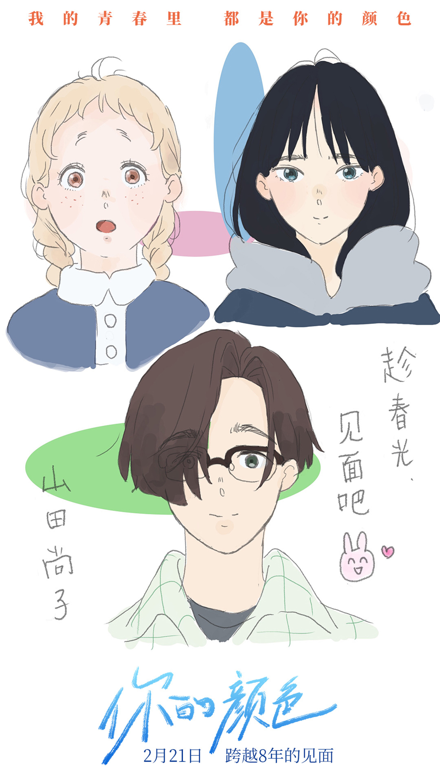 去年6月,在第26届上海国际电影节上,日本动画电影《你的颜色》摘得金爵奖最佳动画片奖。半年多后,这部洋溢着明亮色彩和青春律动的电影将于明天上映,正式与中国观众见面。导演山田尚子为中国观众特别绘制的角色手稿图也与今日发布,日暮窦子、作永君、影平路易三位主角青春洋溢的脸庞与身后缤纷的色彩相互辉映,从手稿可爱的画风就能感受到影片中满满的温暖与治愈。落款处“趁春光,今天见面吧”的观影邀请也蕴含着导演的真诚与期待。