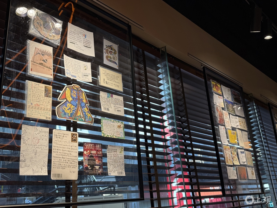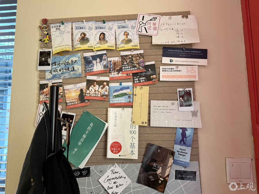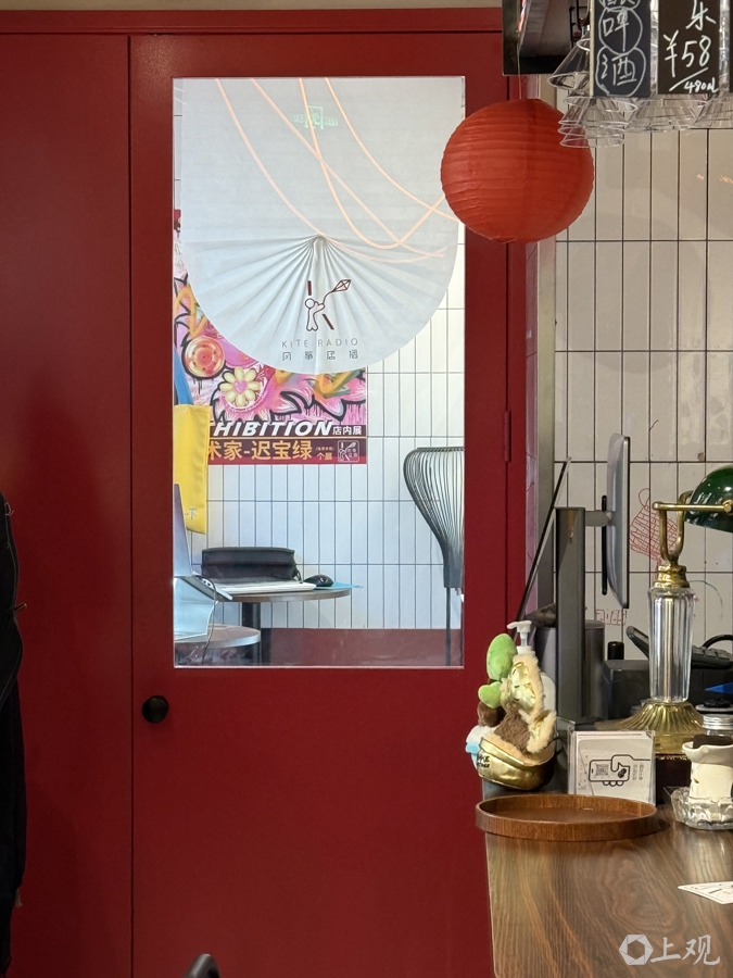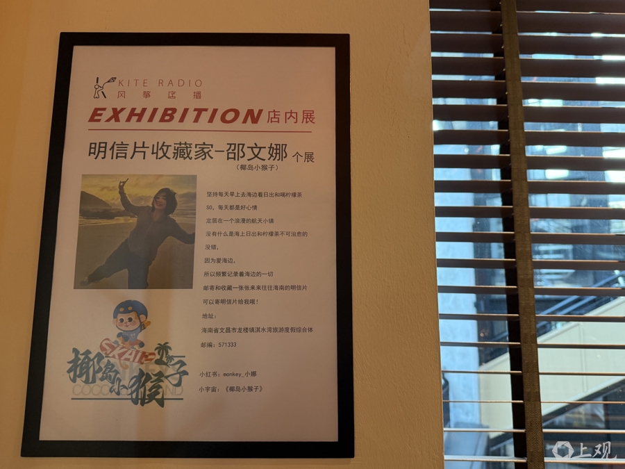 经过大半年的筹备,“风筝店播”开业了,成为上海第一家播客主题咖啡店。麦磊更愿意将这方小天地定义为复合的艺术空间。上周,“风筝店播”刚刚举办又一次播客节目开放麦,是一场观影会后的各抒己见。免费开放的播客录音室时不时有其他播客预约使用,店里一面墙上正在举办明信片主题的艺术展。