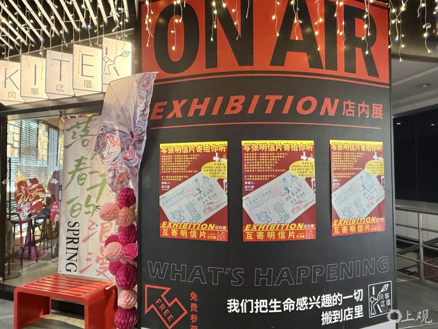 中山公园地铁站6号出口自动扶梯旁,黑底红字“ON AIR”(在广播中)捕获路人的注意。这是玫瑰坊沿街一家小店,灯箱店招显示“风筝店播”。41岁的麦磊在店门口挂上了一个色彩斑斓的风筝,加上其他招贴、装饰,让小店入口颇有几分艺术气息。