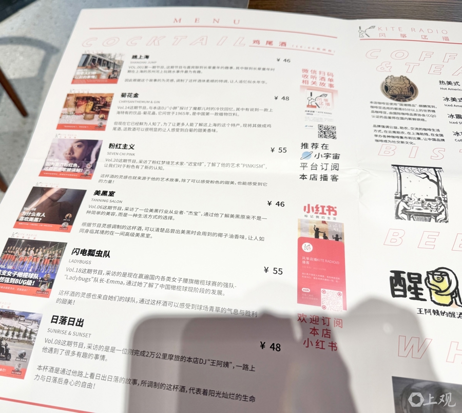 首先是咖啡和饮品,麦磊递给记者两份菜单。1.0版本的菜单就像一份报纸,翻开内页分别是鸡尾酒和咖啡介绍,下午4点以后供应的鸡尾酒与播客节目内容有很强的关联,比如“跳上海”就是第一期节目中聊到长辈童年时期在苏州河上玩跳水的有趣经历;“菊花金”出自第十四期节目,那是与主播“小胖”一起聊的魔都冷饮回忆,说到一款上海的饮品菊花晶,菜单介绍“这是中国第一款植物饮料,为让更多人了解这一上海特产,将其做成鸡尾酒,可以明显感受到白菊的甜美香味”。