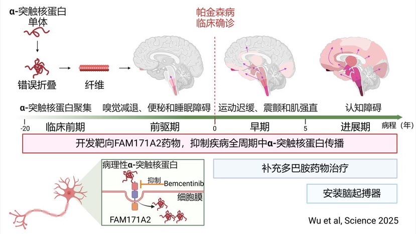 借助人工智能技术,团队从7000多种化合物中锁定一种特殊小分子,能有效阻断FAM171A2与毒性蛋白结合。这种药物可在临床前阶段介入,比现有疗法提前十余年干预病程。 帕金森病患者在出现运动症状之前十几年,大脑内就已存在α-突触核蛋白病理,本次研究发现有望在疾病的临床前期、前驱期和临床期通过靶向抑制原创新靶点FAM171A2以阻断病理性α-突触核蛋白传播,延缓帕金森病进展。 此外,开发靶向FAM171A2新药还可补充目前在临床期改善运动症状的补充多巴胺水平的药物治疗、在临床晚期用脑起搏器的神经调控治疗手段,构建更完善的帕金森病标本兼治的治疗新体系。这不仅将为数以百万计的帕金森病患者带来福音,更标志着我国生物医药领域在帕金森病的“原创靶点发现-机制解析-产品开发”这一全链条自主创新道路上实现了具有里程碑意义的重大突破。