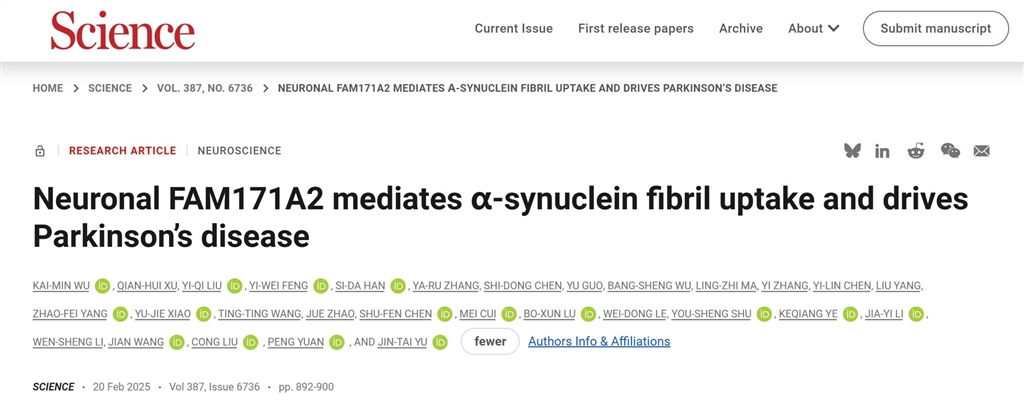 近期,国家神经疾病医学中心、脑功能与脑疾病全国重点实验室、复旦大学附属华山医院郁金泰团队通过5年的临床和基础研究获得重大科研突破,全球首次发现帕金森病全新治疗靶点FAM171A2,并成功筛选出具有治疗潜力的小分子化合物,有望从疾病早期对帕金森病进行干预,延缓疾病进展。结合现有的对症治疗手段,将会实现帕金森病病因治疗与症状缓解的双重突破,造福数百万患者。相关研究成果于2月21日在线发表于国际顶级期刊Science(《科学》)。