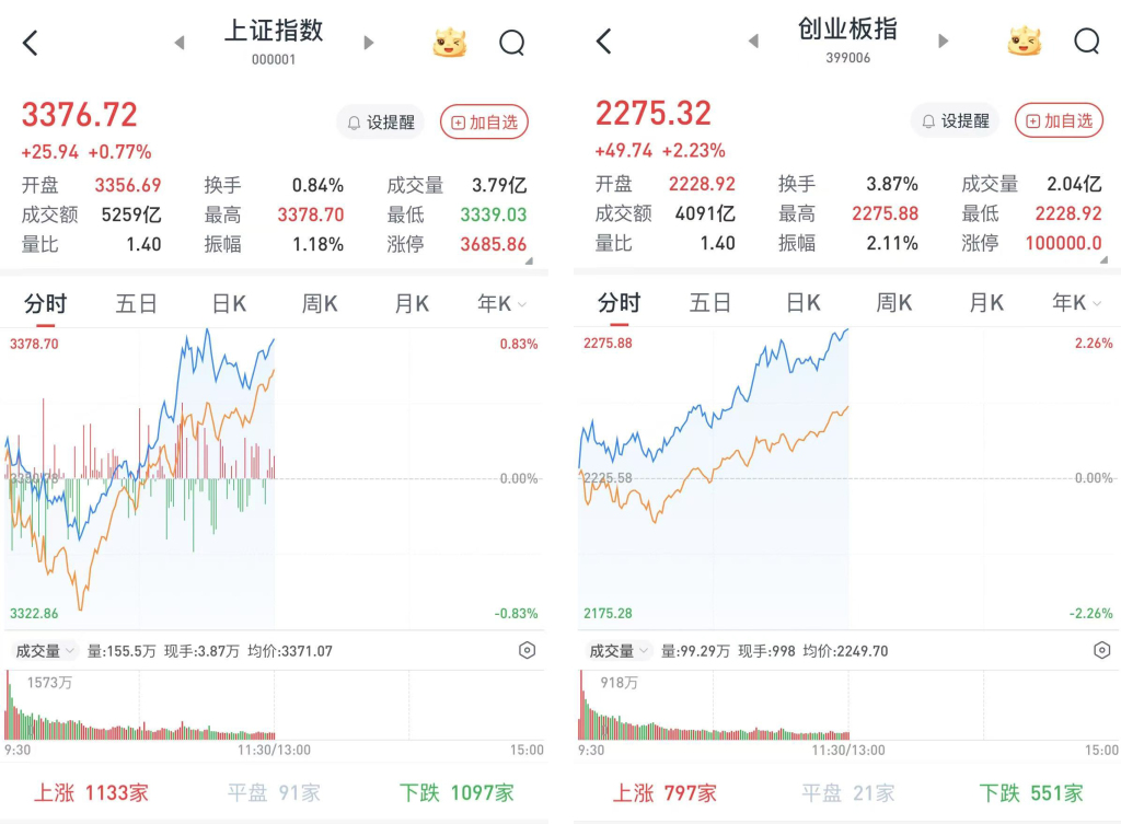 至午间收盘,上证综指涨0.77%,报3376.72点;科创50指数涨5.16%,报1086.35点;深证成指涨1.62%,报10969.76点;创业板指涨2.23%,报2275.32点。