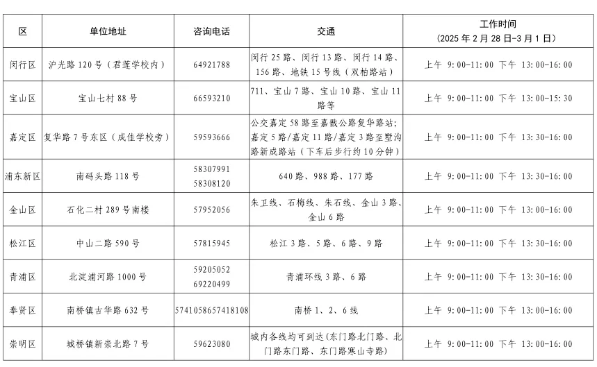 往届生和返沪生完成网上报名后,须于2月28日(星期五)至3月1日(星期六)前往报名所在区的招考机构,现场确认报名信息,确认时须带好报名证明材料(各区确认地点和时间,证明材料要求详见下方)。