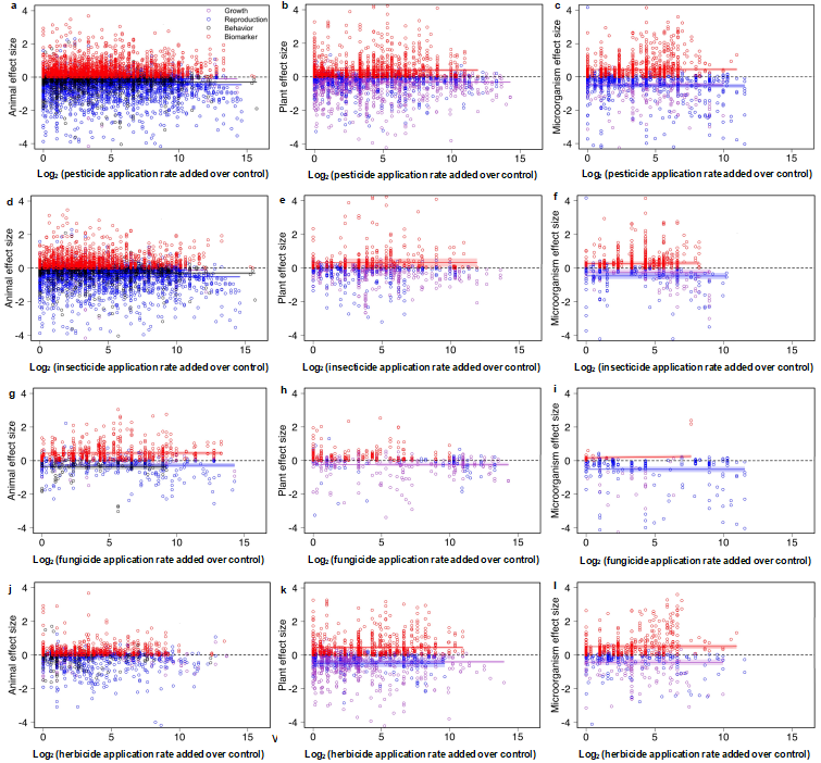 为防止过分夸大农药剂量对非靶标生物的负面影响,研究人员也构建了田间推荐使用农药剂量、水域推荐农药使用剂量如何影响非靶标生物的数据库,结果显示:尽管推荐农药使用剂量的数据样本量不如所有农药使用剂量(所有农药使用剂量包括:不高于推荐农药使用剂量和高于推荐农药使用剂量)的样本量,但将农药使用剂量固定在推荐剂量范围内,杀虫剂、杀菌剂、除草剂对非靶标动物、植物、微生物的负面效应仍旧出现。