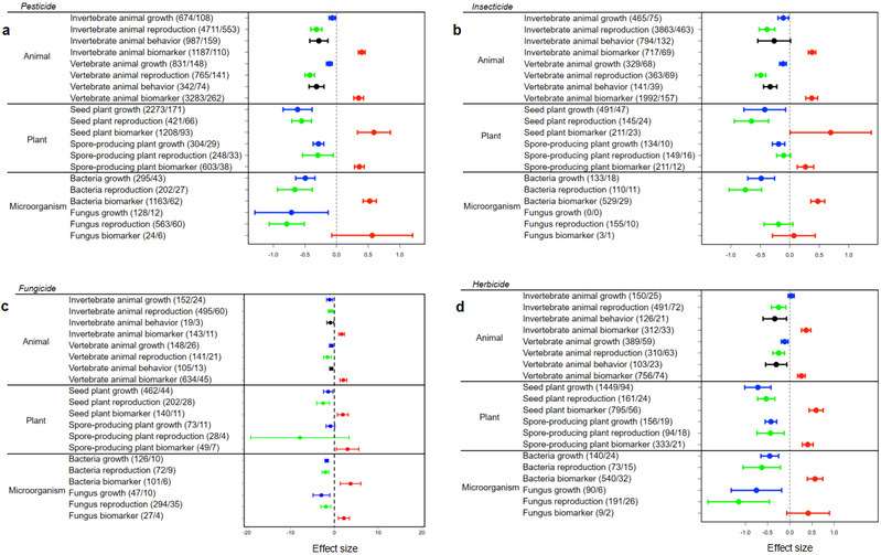 农药影响无脊椎/有脊椎动物、单子叶/双子叶植物、真菌/细菌的全球试验结果