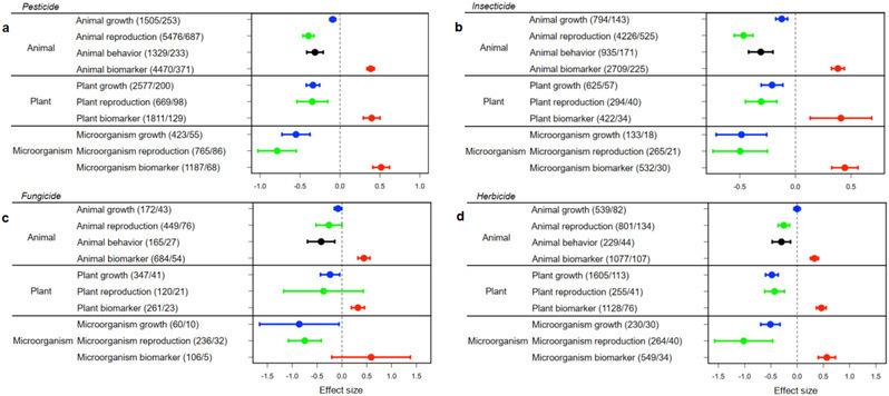 该研究分析了不同场景下农药对非靶标生物的影响,结果显示,室内条件下农药对非靶标动物、植物、微生物的负效应与上述类似。相比于室内条件,田间试验的样本量相对较少,农药的负效应趋势依旧存在,但总体低于室内结果的负效应。在不同气候带中,研究人员发现,温带地区农药对非靶标生物的负面效应强于热带地区。这可能与热带地区农药降解、解毒和消散更快有关(例如,增加的紫外线照射和更高的温度,加快了农药失活以及降低了农药杀虫杀菌灭草效果)。将非靶标生物分别暴露于陆地和水域环境条件,农药的负效应均仍然存在。