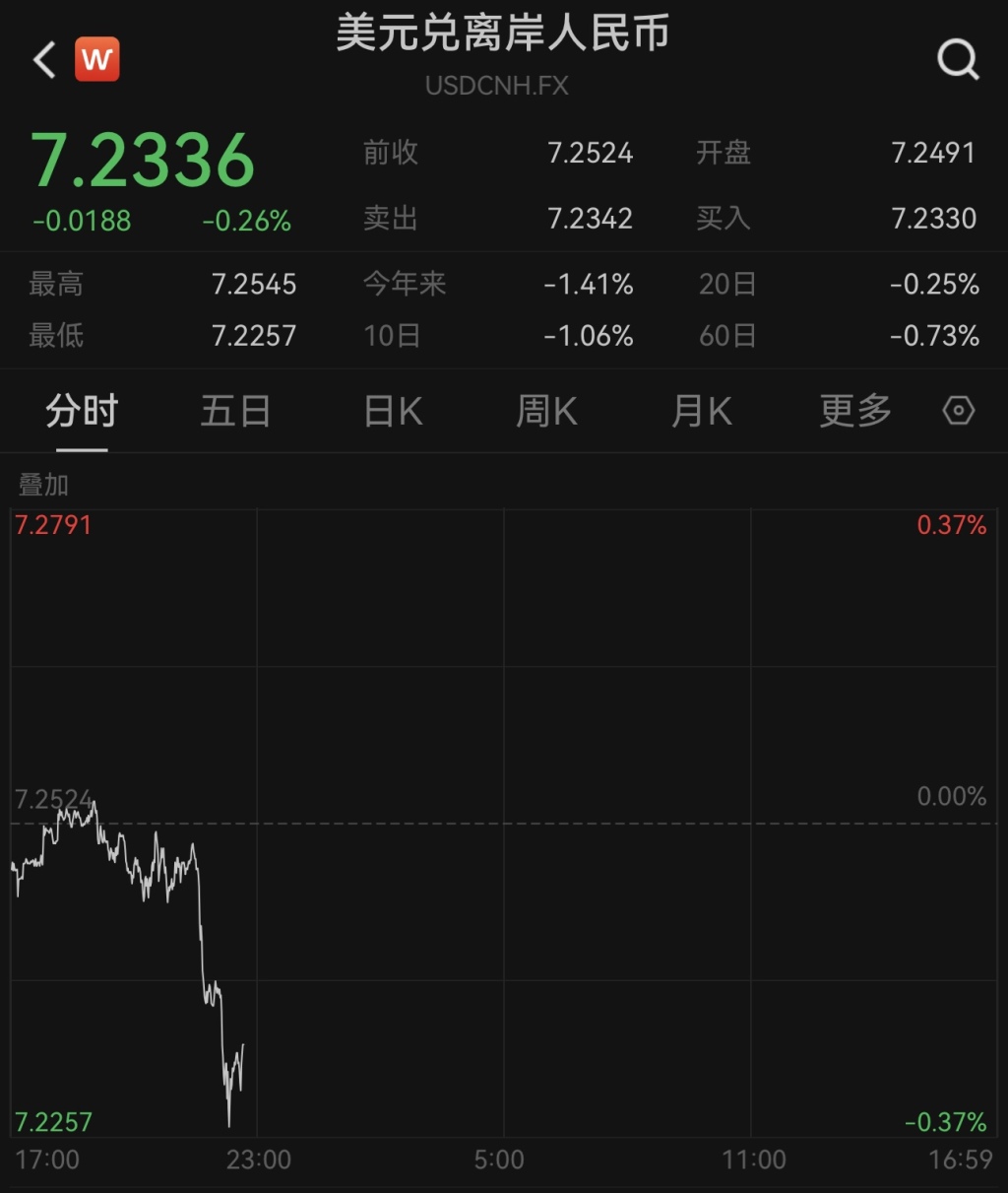 涨超200点,在岸、离岸人民币对美元汇率一度升破7.23
