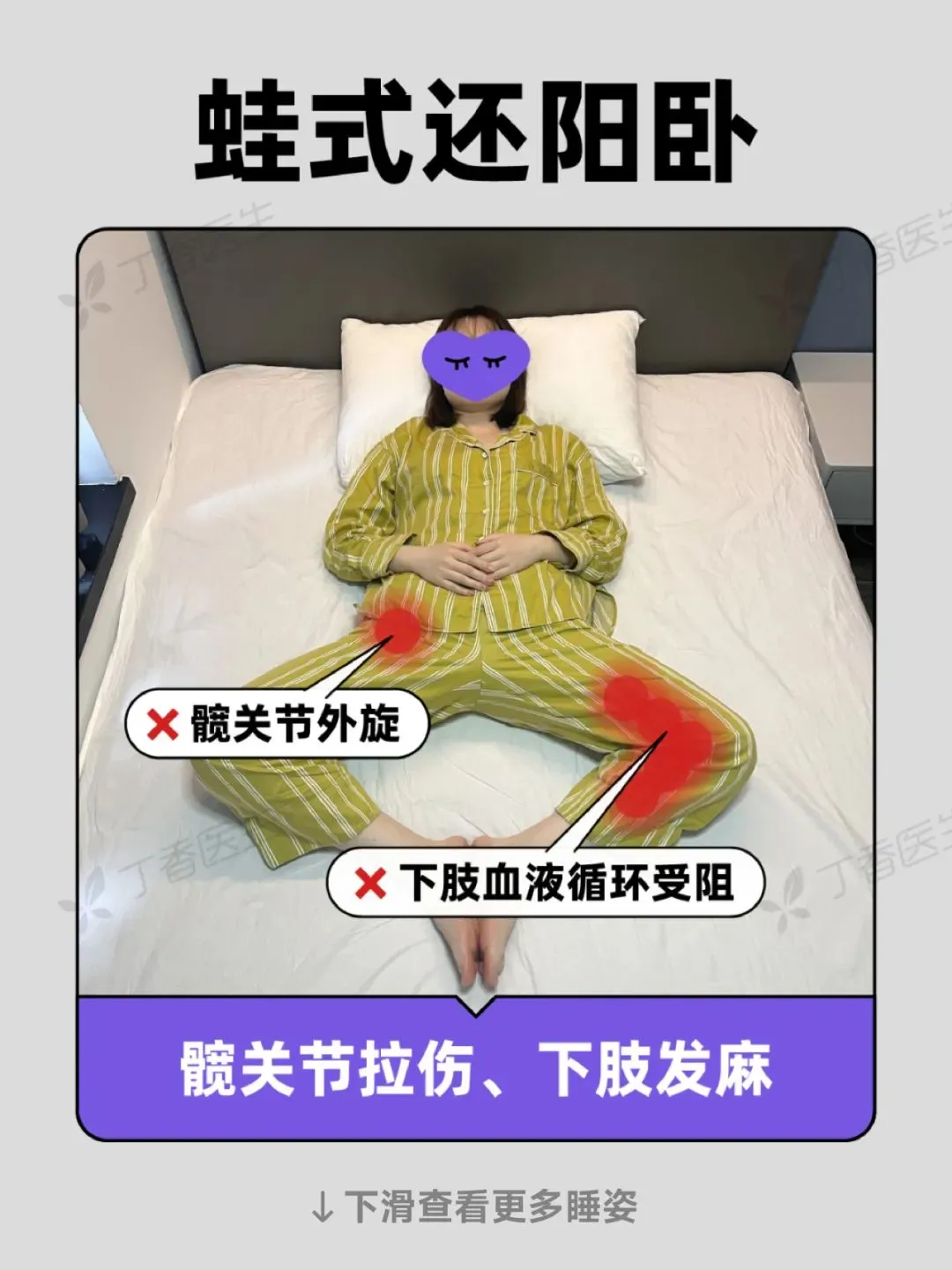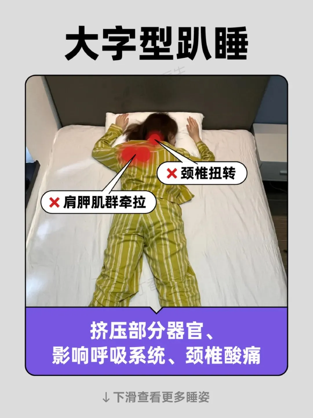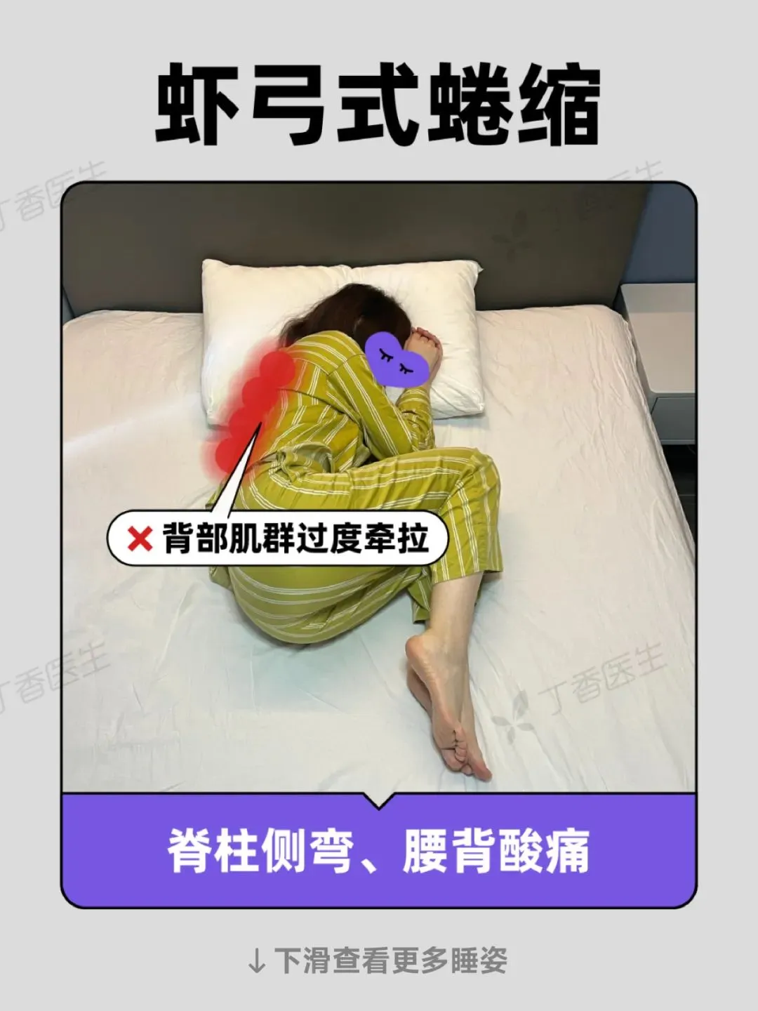 其实,这有可能是睡姿的“锅”。姿势千奇百怪,却有一些伤身的共性,比如:局部肌肉过度牵引紧张,器官内脏受压迫,伴随着酸痛和僵硬,脊柱、腰椎变形等等。