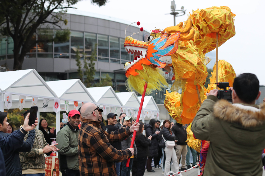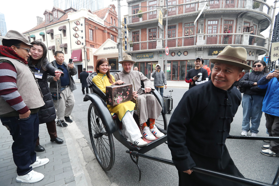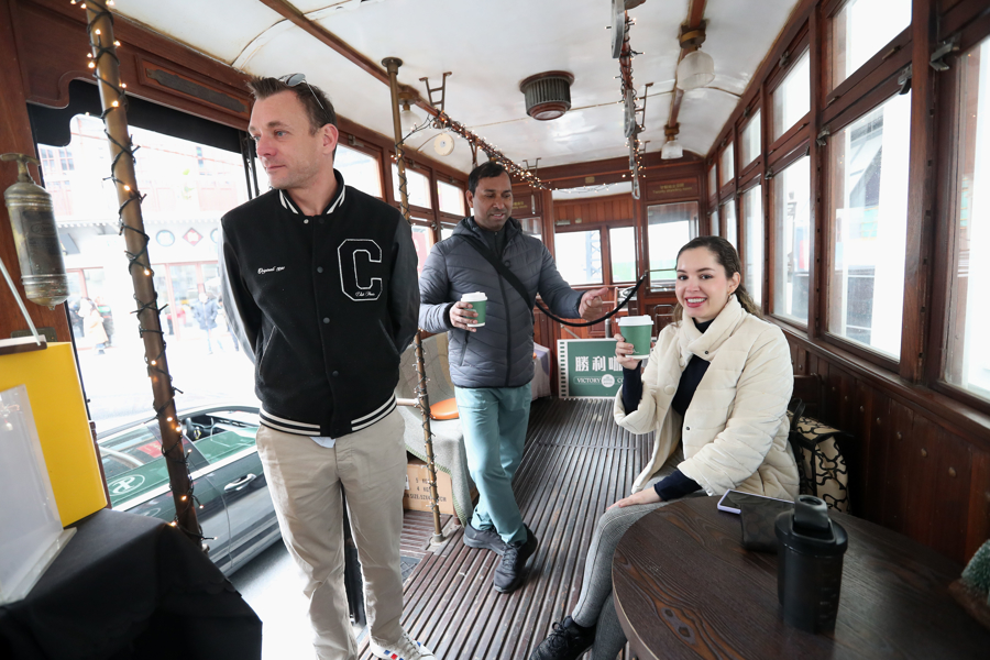 在乍浦路的胜利电影院门口,外国游客欣赏了气势磅礴的舞龙表演,感受到中国传统民俗文化的独特韵味,还登上复古电车,品尝一杯咖啡。