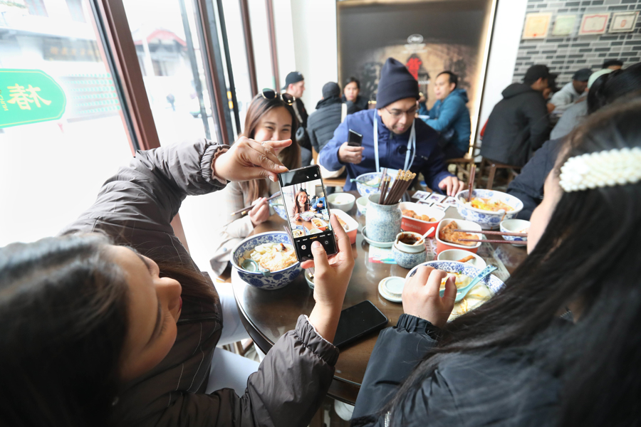 来自印度的自媒体博主伊甸,则拿出手机拍起了直播视频。在乍浦路的小吃店里,他第一次尝试使用筷子吃素面,虽然用得很不习惯,但手嘴并用,还是很满足地尝到了中国美食的滋味。