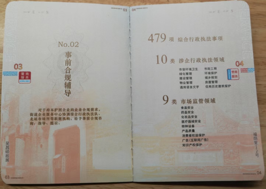 打开“营商护照”的褐色外皮,扉页贴着这家企业的专属信息,再往里面翻:汇集了共享空间、事前合规辅导、装修等工程备案助理、专属金融服务、快捷医疗通道等十类企业服务项目,每一类服务中还会列上具体服务事项。如,事前合规辅导,有479项综合执法事项、10类涉企行政执法领域、9类市场监管领域;辖区内可供企业免费使用的共享空间,有三类场地、八处场所,总面积达4886平方米。