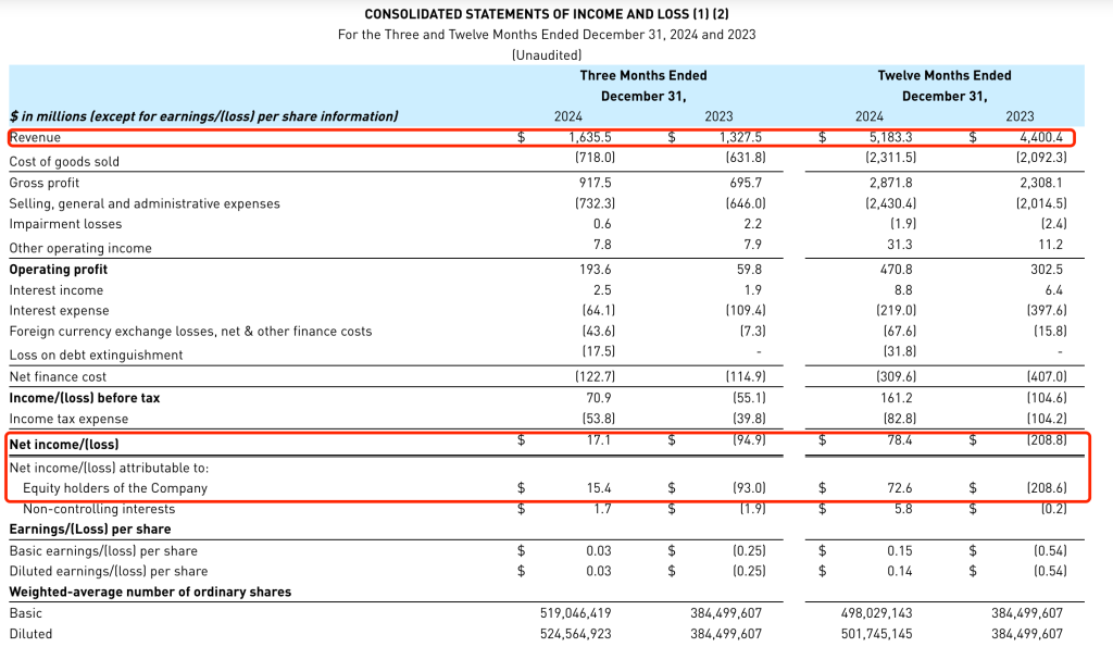 2月25日美股盘前,运动和户外品牌集团亚玛芬体育(NYSE:AS,Amer Sports)发布2024年第四季度及2024年年报。去年四季度实现收入16.36亿美元,同比增长23%;净利润0.15亿美元,实现扭亏为盈,上年同期为亏损0.93亿美元,毛利率增加370个基点至56.1%。2024年全年实现营收51.83亿美元,同比增长18%,超出原有预期;净利润0.73亿美元,实现扭亏为盈,去年同期亏损2.09亿美元,毛利率增加290个基点至55.4%。