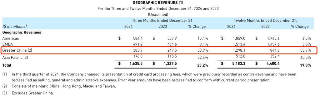 据财报显示,去年第四季度以及去年全年,亚玛芬在大中华区的营收增速继续拔得头筹,四季度实现收入3.84亿美元,同比增53.9%;去年实现收入12.98亿美元,同比增53.7%。