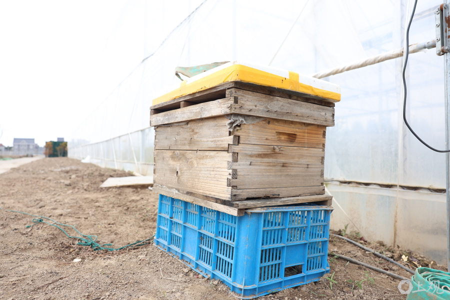 大棚通风口放置了蜂箱,让蜜蜂参与果树开花授粉。