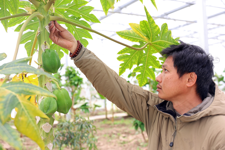 2月27日,位于崇明中兴镇的太和·好时节智慧农场智能大棚内,芭蕉和木瓜、龙眼、荔枝等15种热带水果混合栽种。智能温湿控制和植物生长数字化追踪技术使热带水果在上海安家,让“南果北移”种植得以实现。