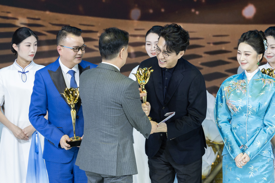 靳东从濮存昕手中接过“白玉兰”奖杯,陈津伟成全家第五位“白玉兰”得主