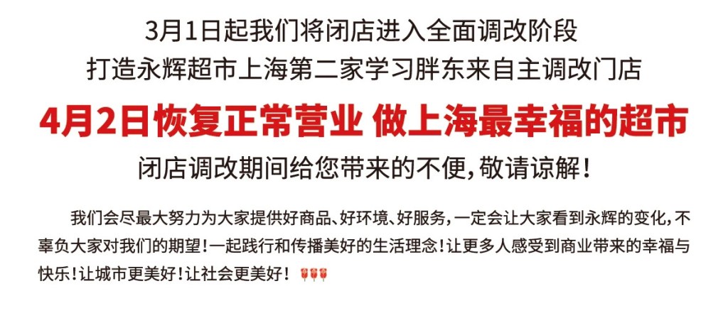 2月28日,上海永辉超市发布《关于永辉超市浦江万达店学习胖东来自主调改说明》,宣布3月1日起永辉超市浦江万达店将闭店进入全面调改阶段,打造永辉超市上海第二家学习胖东来自主调改门店,计划4月2日恢复正常营业。