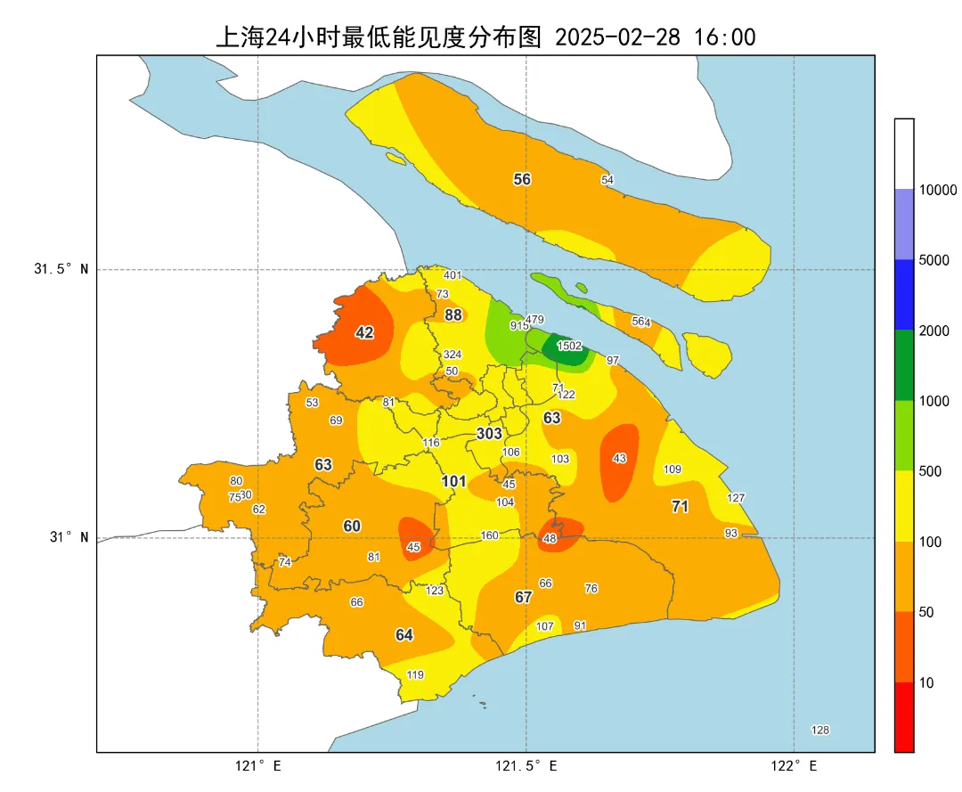 预计今天夜里到明天早晨本市大部郊区仍将出现能见度小于500米的大雾天气,宝山、崇明、浦东、金山、奉贤等地及沿岸海区能见度不足200米。