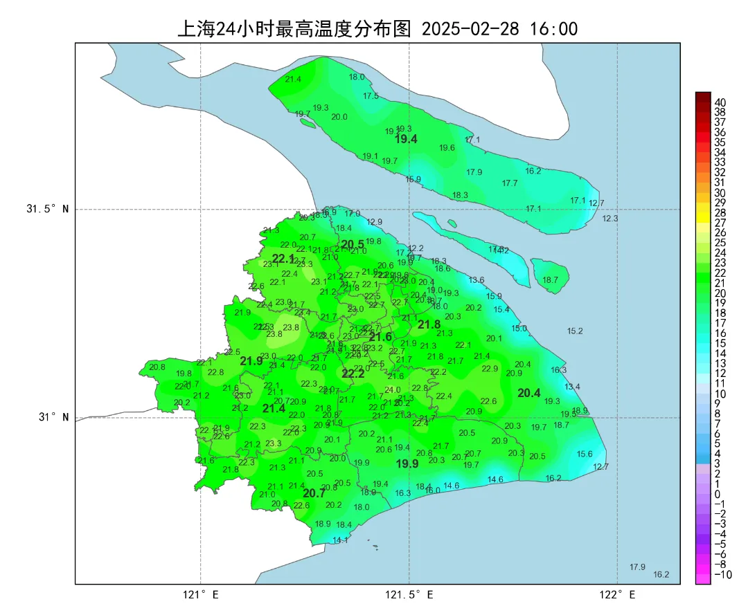 眼下这波暖湿的势头有点猛,上海今天大雾开场,上海中心气象台发布了今年第2个大雾橙色预警信号,大部出现了能见度200米左右的强浓雾天气,许多郊区最低能见度一度仅有50米左右。阳光显露后,大雾消散,气温一路飙升,徐家汇站最高达21.6℃,“2字头”的气温今年首次亮相。