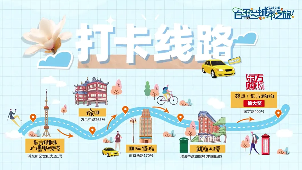 打卡东方明珠塔、武康大楼、豫园华宝楼、国际饭店、五角场彩蛋五大站点,集满印章后冲往终点站,位于国定路400号的【东方购物】,即可兑换由上海造币有限公司打造的白玉兰纪念章!(限量500枚!手慢无!)
