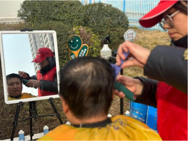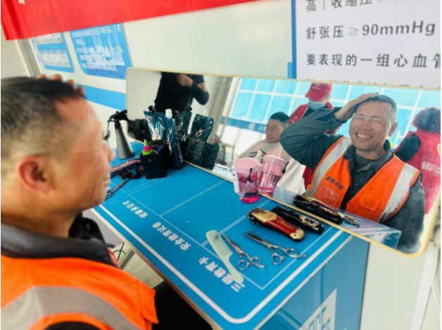 “最近咱工地忙,这马上到二月二了,本来打算抽时间出去剪个头,这下不用跑了,还省时间,你还别说,剪完一下子精神了,戴上安全帽也轻松了许多。”刚理完发的木工李师傅看着镜子里的“新发型”满意的笑着。