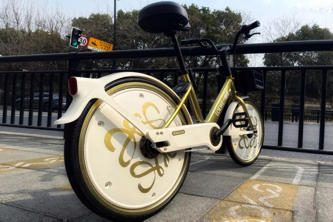 在淞虹路附近,记者看到已有市民骑着哈啰与LOEWE罗意威联名的金色单车出行,其金色的车身和白底金字的简约车轮广告尤为亮眼。