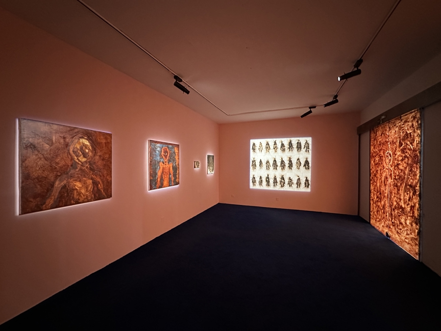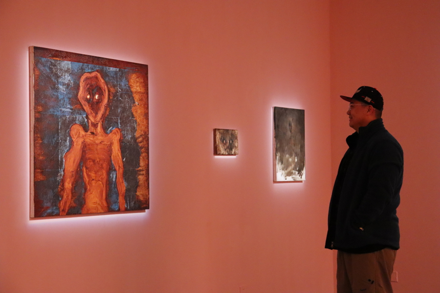 步入展厅,两面落地玻璃被狂放的笔触覆盖,透明铁红颜料在不同光照下呈现出从琥珀色到深赭的色谱变幻。这是马浩然对2019年法国求学时期未竟构想的实现——将建筑表皮转化为“心理空间的物理投射”。“玻璃的透明性制造了双重悖论:观众在外部无法窥见内部,进入后却发现展墙本身即是作品。”马浩然说。这种空间设计暗合展览主题:个体的内在世界既是封闭的孤岛,又是渴望被解读的开放文本。