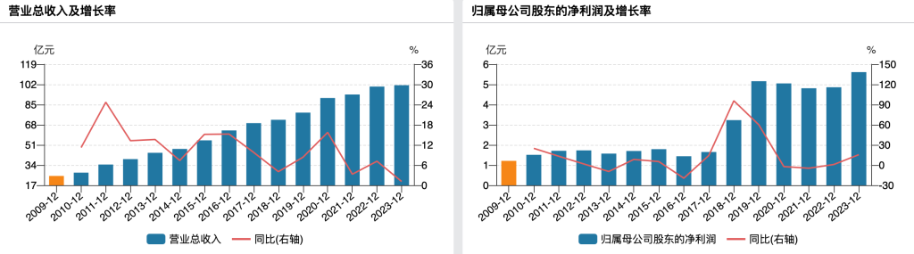 据Wind数据显示,过往近十几年来,红旗连锁的营收呈逐年增长的态势,疫情后盈利水平也在稳步恢复。据2024年三季报显示,前三季度红旗连锁实现营收77.67亿元,同比增长1.65%;归母净利润为3.9亿元,同比下滑4.21%。其中公司主营业务净利润3.04亿元,同比增长1.21%。