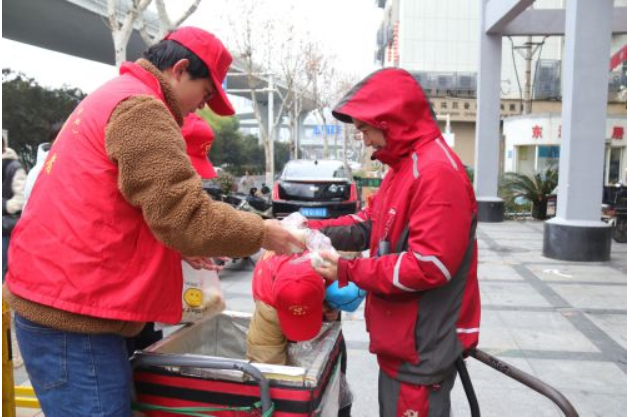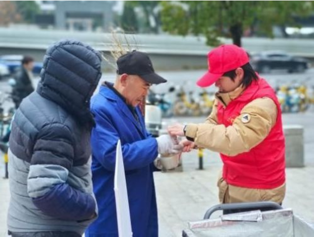 “天气冷,您趁热吃,感谢您为城市美好作出的贡献。”活动中,志愿者们以“爱心粥摊”为站点,将一份份热气腾腾的早餐送到户外工作者手中,并为他们送上真挚的关怀。“早上忙着送单正好没吃饭,你们太贴心了。”负责周边快件派送的京东小哥接着早餐说道。