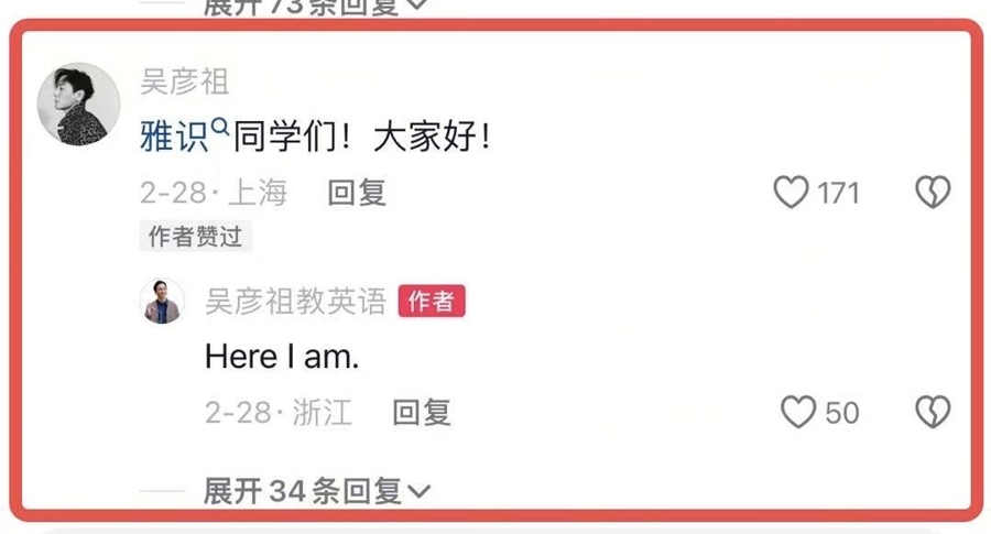 吴彦祖在视频中介绍,自己是在加州长大的美籍华裔,毕业于俄勒冈大学建筑系,之后身份逐渐转变为演员、导演。英语作为他与世界交流的工具,一直陪伴着他走过风风雨雨。而今,他拥有了新的身份——英语口语老师,希望通过自己的经验和努力,帮助更多人提高英语水平。在评论区,吴彦祖本人经过身份认证的账号也来留言互动,佐证了“吴彦祖教英语”账号的真实性。