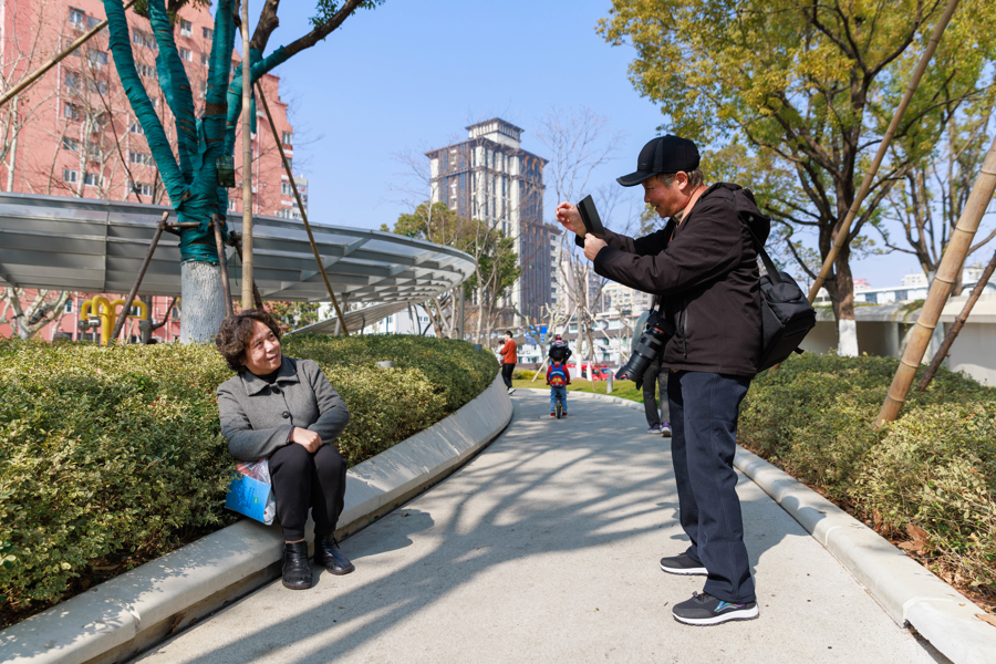 “幸福美拍”摊点上,徐汇摄影协会办公室主任吴士伟忙不迭为老人拍照:“老人都喜欢的,老早来排队了。”老吴端起相机,和老人们在日晖绿地里选景、指导他们摆造型,“咔嚓”一声定格下光影中最美好的瞬间。