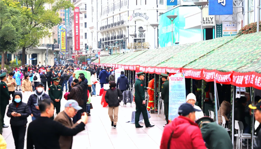 与此同时,在南京东路上开展的学雷锋、学八连志愿为民服务活动也拉开帷幕,黄浦区人武部组织军地80余家单位共同参与。18顶迷彩帐篷东起福建路、西至浙江路一字排开。在服务单位中既有来自南京路上好八连、上海警备区纠察队、长征医院、武警上海总队执勤第四支队十中队、南京路女子民兵连等部队单位,也有来自团区委、区消防救援局、南京东路志愿服务“发起人”第一医药陶依嘉团队、永安百货、上海第二轻工业学校、上海的士雷锋车队为代表的党政部门、企业事业单位、中小学、社会志愿团体等地方单位。服务项目涵盖量血压、测体重、测血糖、理发、推拿、饰品清洗、法律咨询、健康测评、口腔检查、眼镜清洗、手机贴膜、免费茶水、红色宣讲、篆刻、缝纫、补鞋等60余项。