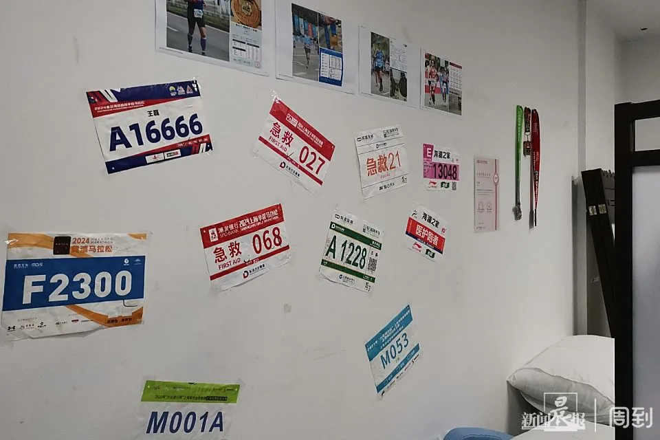 小侬了解到,门诊负责人王磊主任医师还是一位资深跑友,个人完赛过30个全马,半马50多个,甚至还完成过百公里挑战赛。诊室的墙上就贴着不少王磊医生参赛马拉松的号牌。