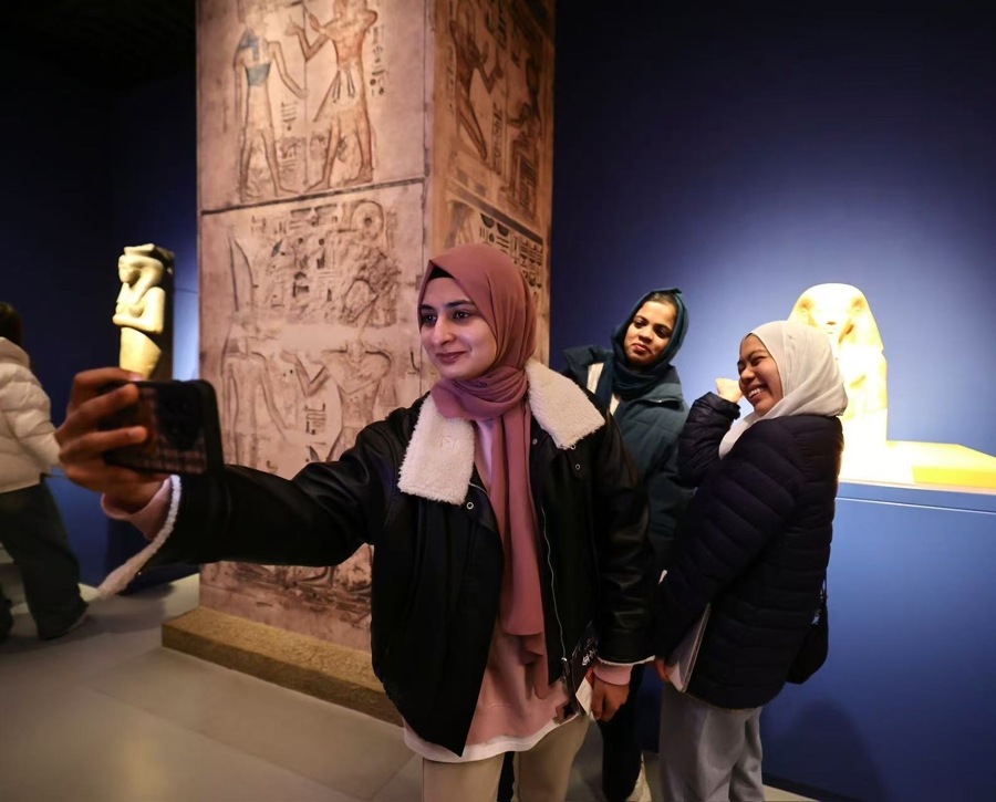 下午2时,参与者准时聚集在上海博物门前,一抹白色身影成为人群中最为亮眼的一群。来自埃及的上海交通大学人文学院大三留学生华小文为了此次参观,换上了埃及的传统民族服饰。“此前,我就在短视频平台看见埃及博主参观这个展览,里面的文物都非常珍贵,让我感觉回到了埃及。今天我也精心打扮,准备发给家人看,让他们看到上海对世界文化的包容和展示,在这里就像在家乡一样。”