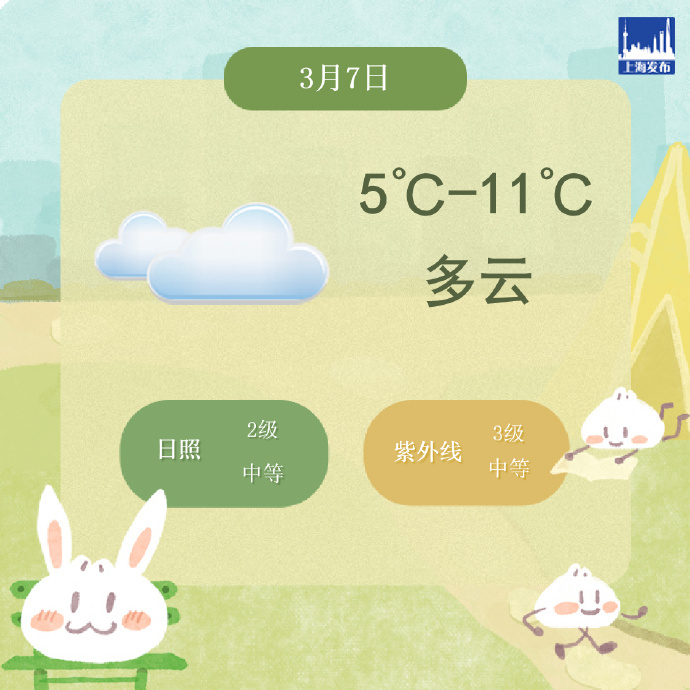 上海今天多云为主,偏北风3-4级,中午转偏东风,全天气温在5℃-11℃之间。本周六至周日前期,上海是阳光的主场,多云为主,气温继续小幅回升,最高可达13℃-14℃,洗晒、出行两相宜。