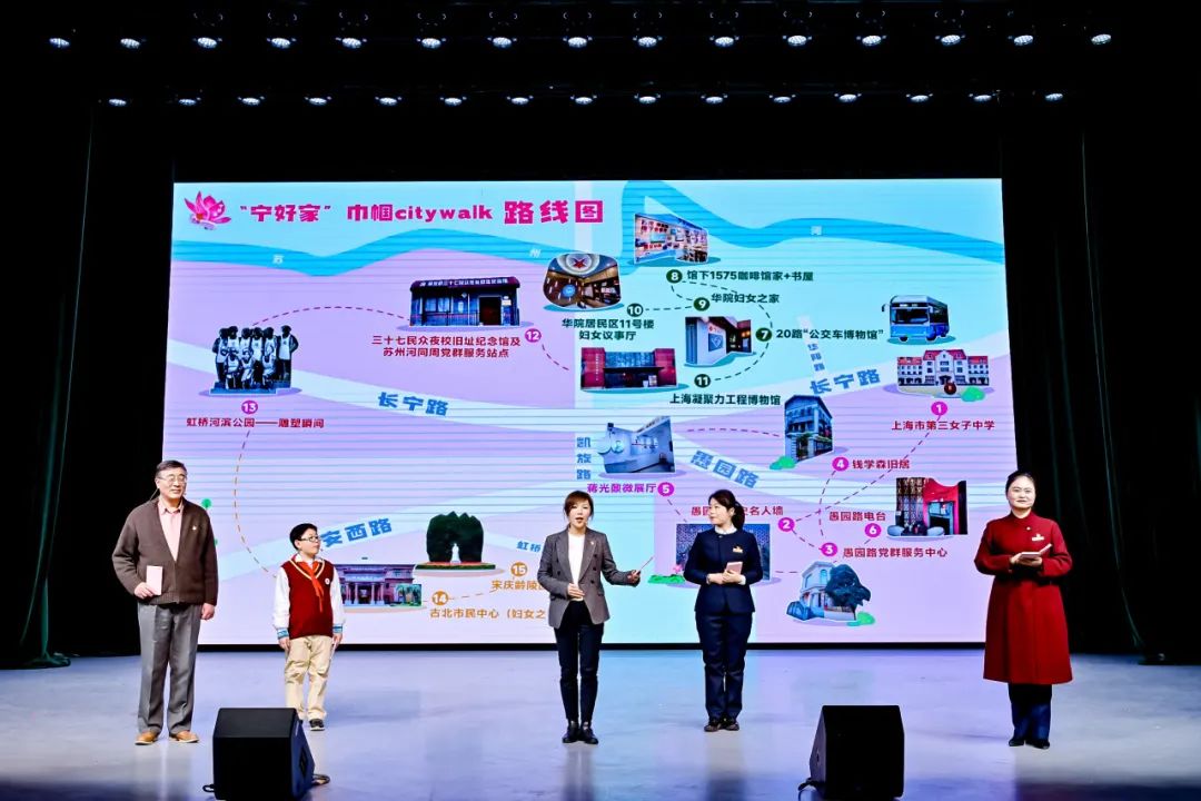 “引领·她风尚”篇章现场“沉浸式”演绎了《“宁好家”巾帼Citywalk,文化宣讲员集结!》。该剧依托长宁区一条贯通“昨天、今天、明天”时空维度的文化地标漫游线路,通过巾帼志愿者、儿童志愿者和家庭志愿者的生动演绎,鲜活呈现“一条愚园路、半部近代史”的历史文脉传承,深入诠释作为“凝聚力工程”发源地和“全过程人民民主”首提地的时代价值,激情畅想长宁建设具有世界影响力国际精品城区的美好蓝图,引领更多的人感受长宁红色文化、海派文化、江南文化的魅力,让城市记忆在行走中焕发新生。