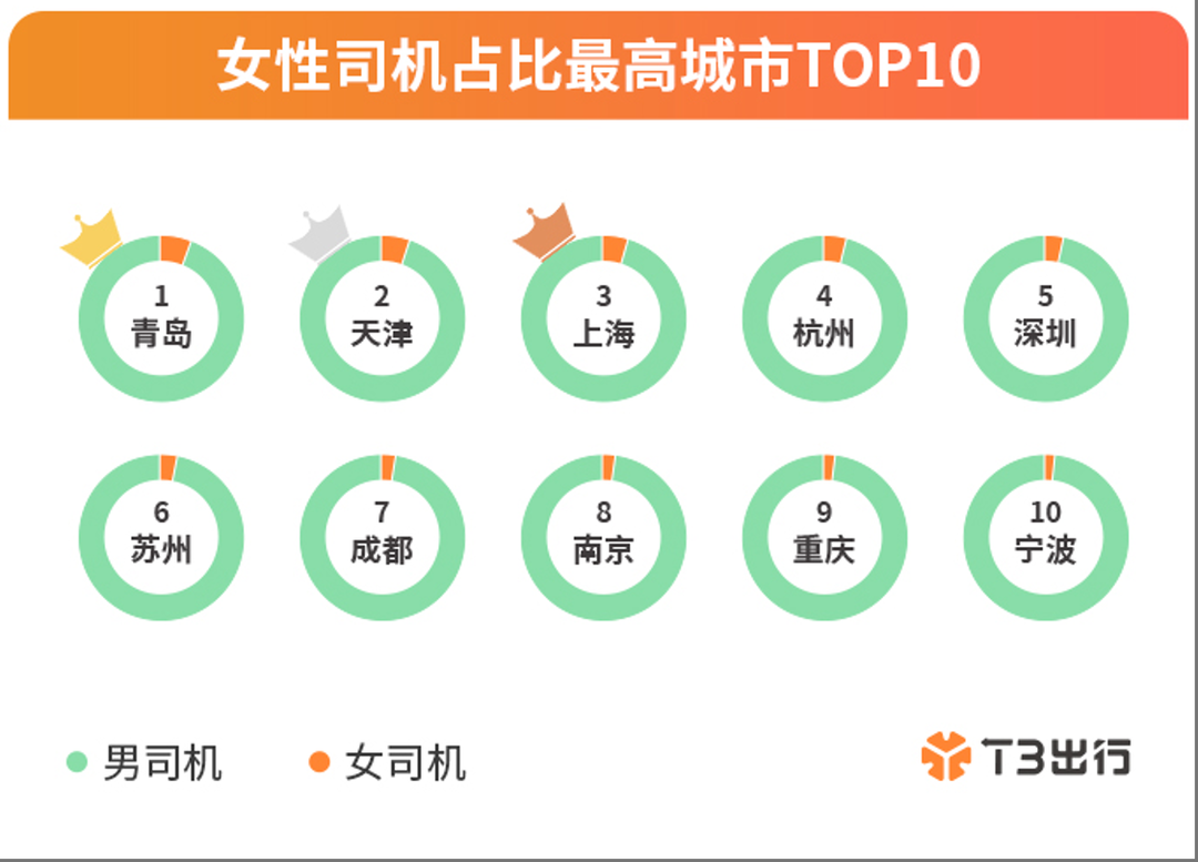 那么,哪些城市的女性更青睐从事网约车司机这一职业?报告显示,在平台160多个运营城市里,青岛、天津、上海三城的女性司机数量占比位居前三,杭州、深圳、苏州、成都、南京、重庆、宁波紧随其后,分列第四至第十名,一线、新一线城市女性从事灵活就业意愿更强。