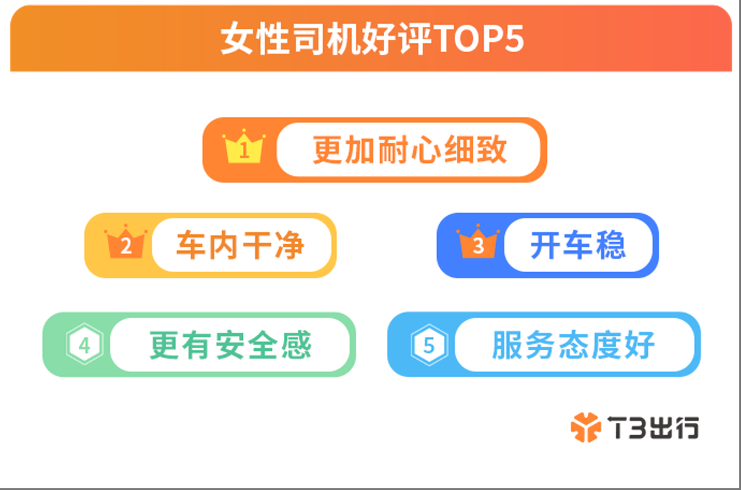 不少女性司机还倾向于就近就业,以便照顾家庭。从T3出行女性司机就业地来看,25%的女性司机为省内就业。此外,服务乘客的过程中,女性司机展现出沟通能力强等天然优势。报告指出,女性司机五星好评率高于男司机,“耐心细致”、“车内干净”、“开车稳”、“有安全感”、“服务态度好”是排名前五的乘客评价。