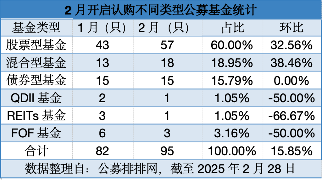 从供应端来看,公募排排网最新数据显示,2025年2月公募基金市场呈现显著回暖态势。截至2月28日,当月开启认购的公募基金数量达95只,较1月份的82只环比增长15.85%。