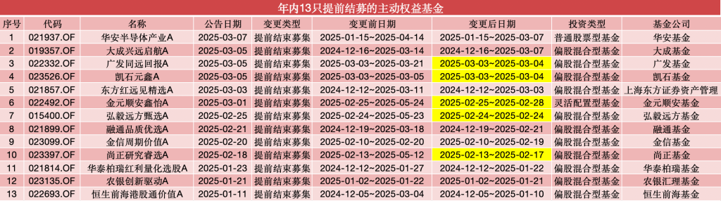 整体来看,Wind数据显示,截至3月7日,年内已有72只基金提前结束募集,其中包括大成兴远启航、东方红远见精选、融通品质优选等主动权益类基金,也有国泰创业板50指数、国泰上证科创板综合ETF、富国上证科创板综合价格ETF等被动型基金,还有中欧稳添90天滚动持有、万家鑫明等债券型基金。