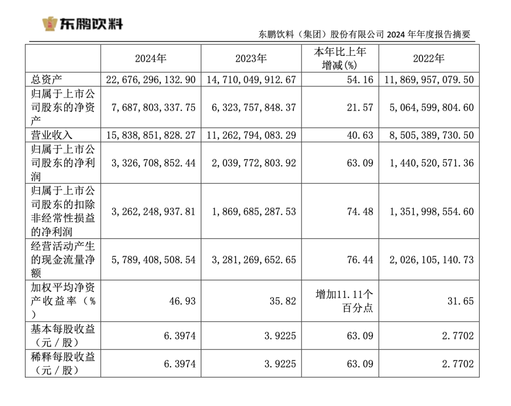 3月7日,功能饮料制造商东鹏饮料(集团)股份有限公司(东鹏饮料,605499)公布2024年度业绩,去年营业收入为158.39亿元,同比增加40.63%;归属于上市公司股东的净利润为33.27亿元,同比增长63.09%,主要是报告期内公司的销售规模和效益保持高速发展。公司基本每股收益6.3974元/股,同比增长63.09%。