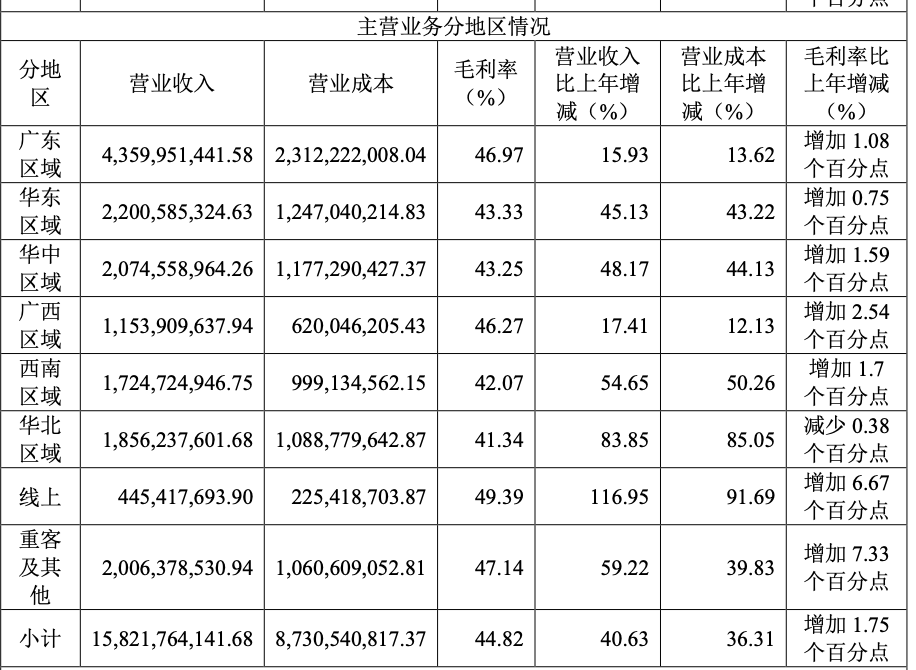 分地区情况看,该公司主要的销售区域为广东、华东、华中、华北、广西及西南等市场,合计营收占总营收比重约84.50%。广东区域为收入占比最高的区域,通过继续实行全渠道精耕策略,在薄弱地区重点投放资源,减少地区之间的不平衡,广东区域在2024年实现营业收入43.60亿元,同比增长15.93%,营收占比为27.56%。
